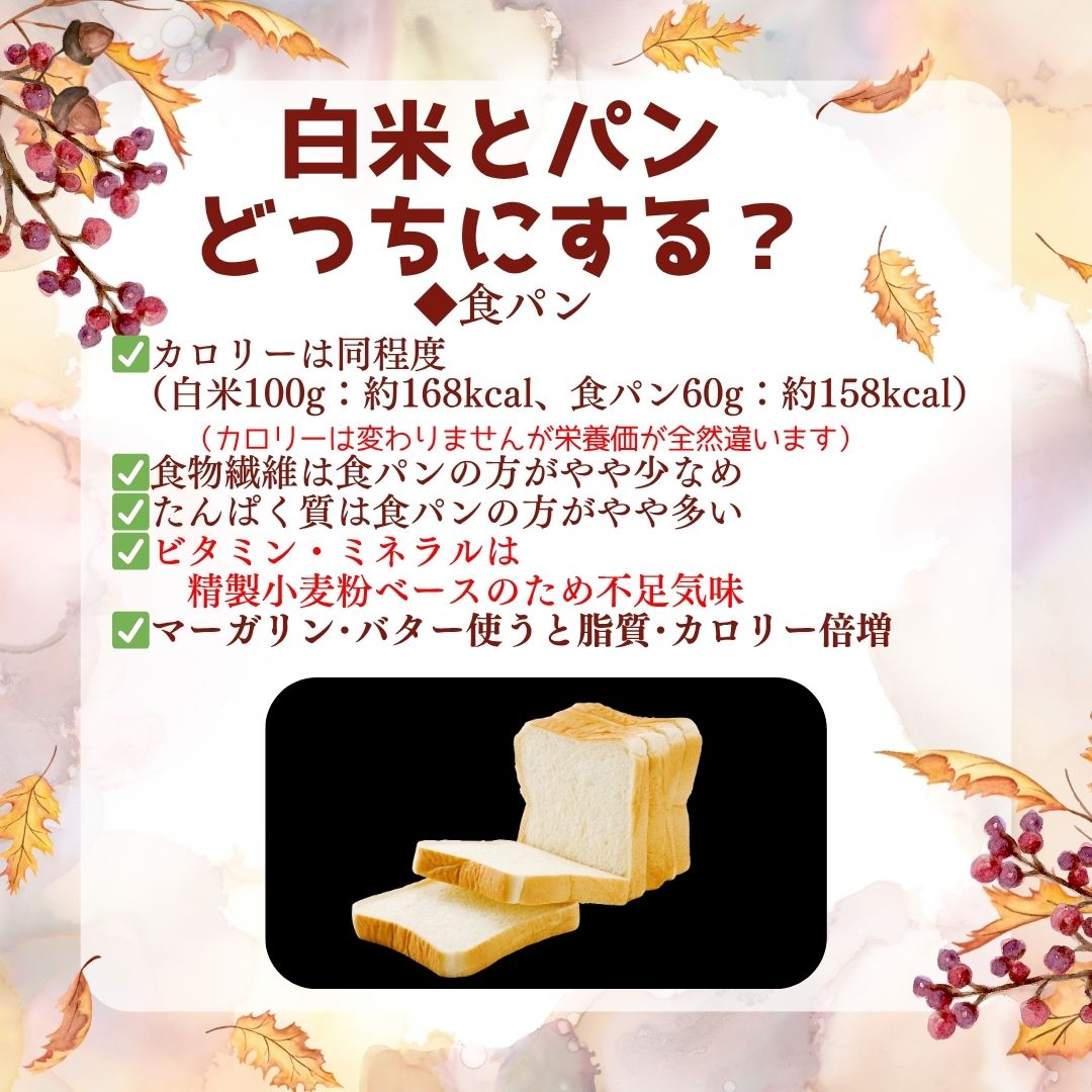 つまり「腹持ち」は白米に近いけど、栄養のバランスは偏りやすいのが食パンの特徴です。